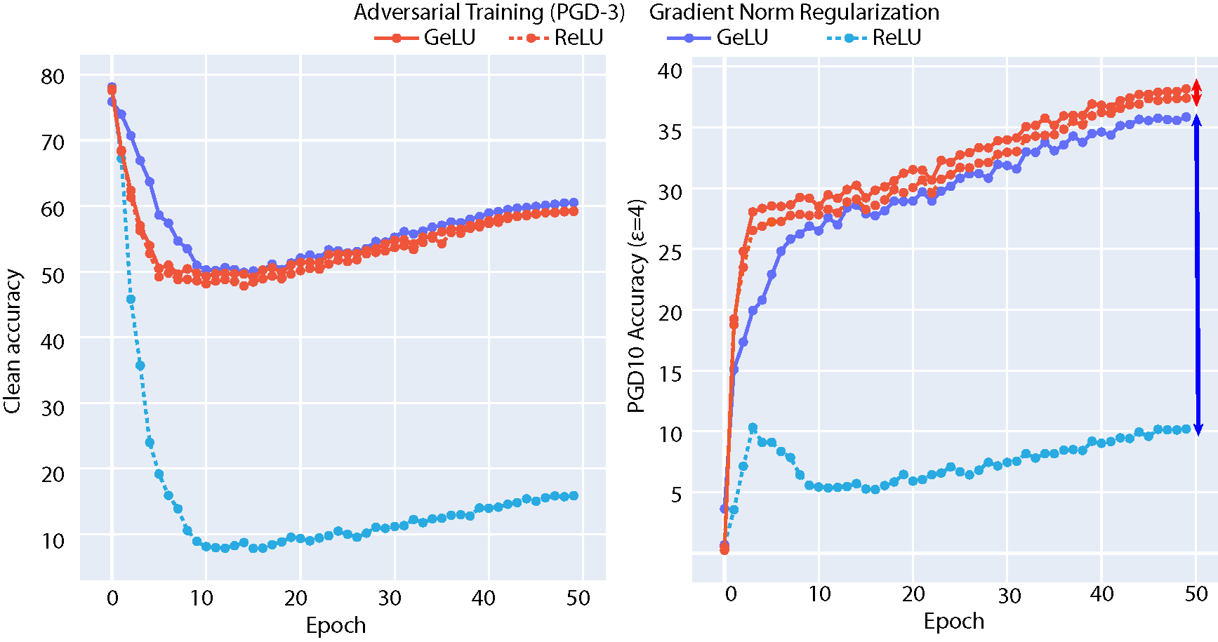 As we can see in the figures below, the ResNet with ReLU is completely incapable of properly fitting gradient norm regularization, with clean performance sharply decaying and robust performance barely increasing. In contrast, the GeLU ResNet displays similar convergence behaviour to the adversarially trained models, obtaining extremely similar clean and robust accuracies. The work of (Xie2021) conducted a similar analysis for Adversarial Training, observing small increases in performance from using smooth non-linearities. For gradient norm the effect is more than 20 times larger (1% vs 23%).