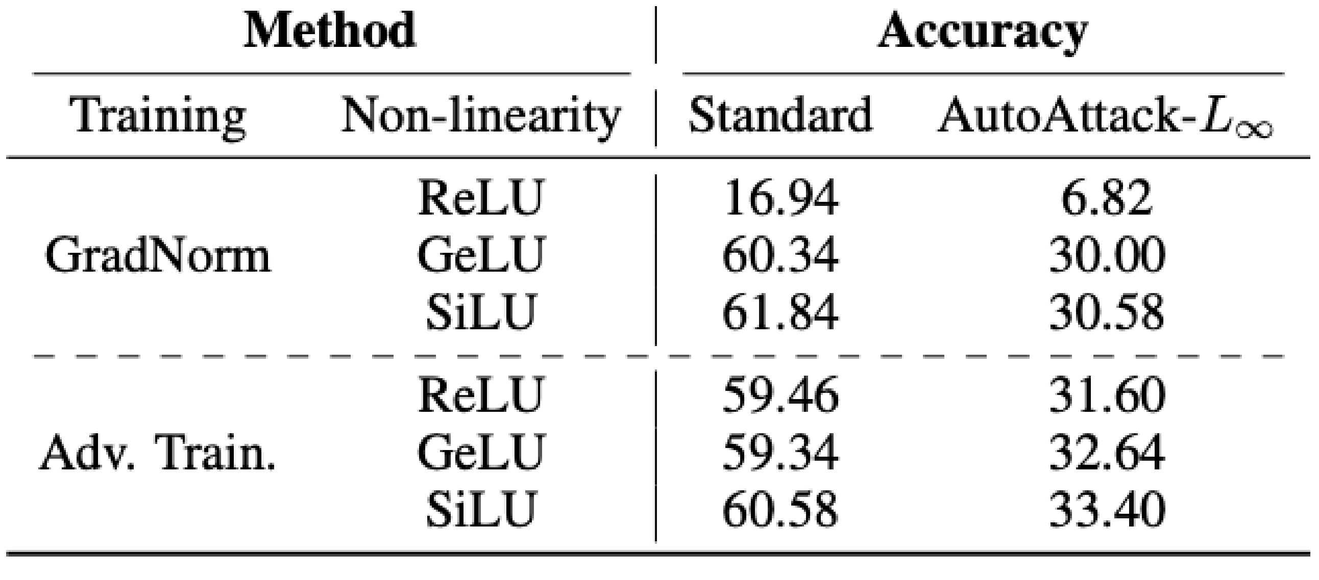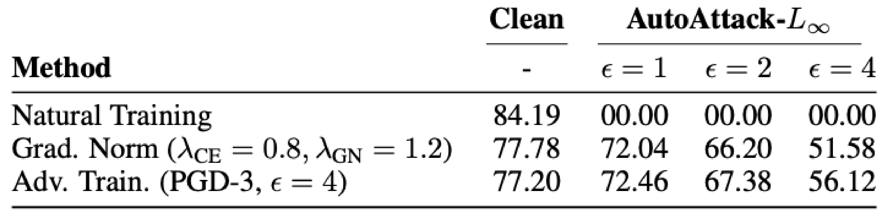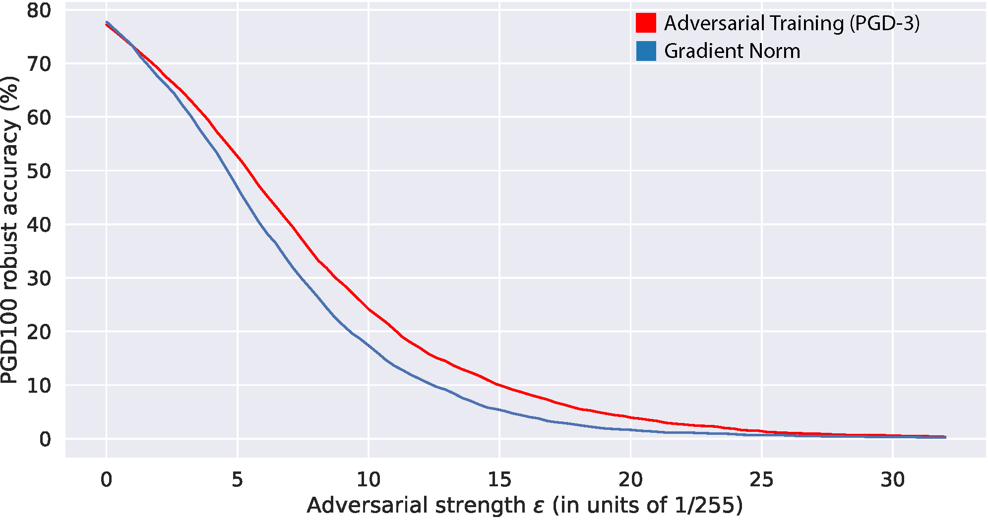 Minimizing gradient norm yields a highly competitive model despite seeing only natural examples and having 60% of the computational budget. On AutoAttack \(L_{\infty}\) with \(\epsilon=\frac{4}{255}\), the standard benchmark for ImageNet, we report 51.58% robust performance compared to the 56.12% obtained by state-of-the-art adversarial training.